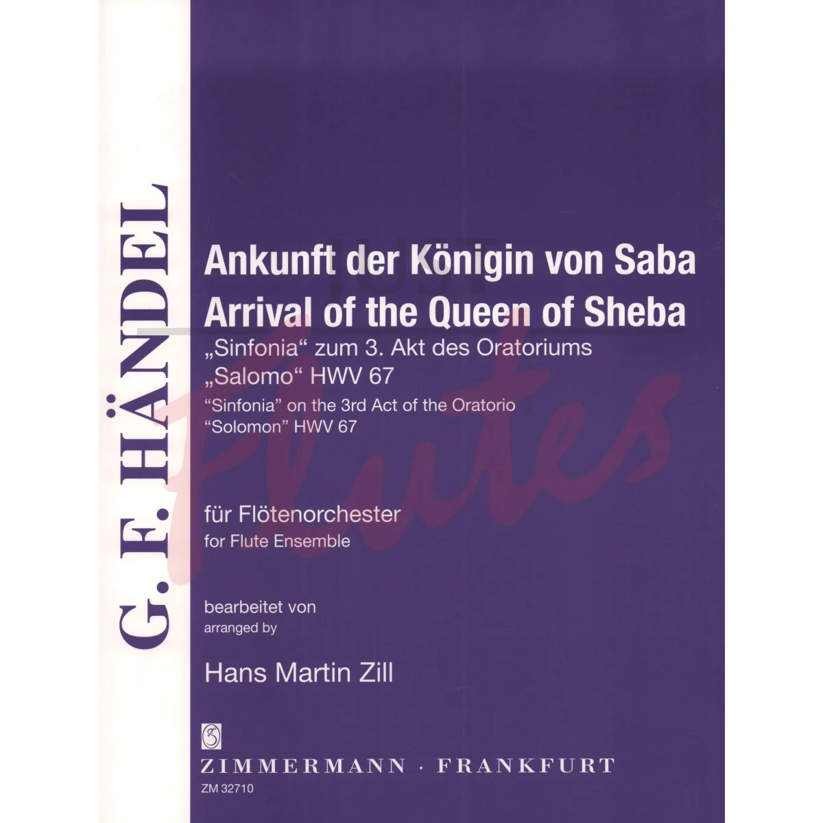 The 'Arrival of the Queen of Sheba' is a piece from Georg Friedrich Handel's oratorio "Solomon", written in 1748 and performed for the first time on March 17, 1749. The arrangements presented here can be performed both by a flute orchestra and a quartet including solo instruments. When using the quartet version, the orchestration "3 flutes and bass flute" should be given preference over the other instrumentations ("3 flutes and alto flute" or "4 flutes"), because it sounds better and does not interfere with Handel's conduct of voices.