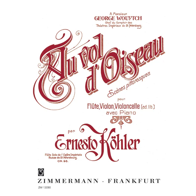 It is the last completed work by Ernesto Köhler, principal flutist at the Imperial Opera in St. Petersburg, and one of his rare chamber works. The "Scènes pittoresques" were published in his death year 1907.Performance duration (approx): 28