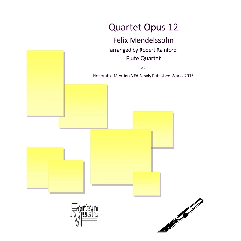 Flute Quartet (2 flutes, alto flute, bass flute) - Mendelssohn began work on his first string quartet in Berlin, but did not complete it until 1829 when he was in London, a city he visited frequently throughout his life. Like all his quartets, it consists of four movements, each with a distinct character. The first starts with a slow introduction followed by a flowing lyrical first movement. The second movement (titled 'Canzonetta') has many similarities to the incidental music Mendelssohn composed for A Midsummer Nights Dream, with fluttering semiquavers and all parts taking flight at times. The third movement starts with a slow, hymn-like melody that builds in intensity until it breaks out into a rush of semiquavers, before settling back to a calm finish. The finale of the quartet is an exciting, Tarantella-like romp, with racing quavers alternating with longer phrases. Melodies switch between parts until everyone joins together in unison passages convering just about the full range of each instrument. This is interrupted by the themes of the very first movement, briefly first of all. The Tarantella tries to re-assert itself, but the first themes will not be denied, and brings the whole piece to a close. In this arrangement, all parts share in the melodic interest. Flute 1 uses just about the whole range of the instrument, and requires some nimble fingers and neat articulation. Flute 2 doesn't ascend quite as high, but still requires good technique. The alto and bass flute parts contribute equally to the quartet as a whole, and will need some good tonguing particularly in the second movement. As in all quartet playing, communication between the players is paramount to get the maximum out of this lovely composition.